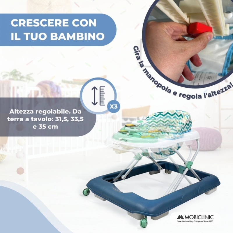 ALTEZZA REGOLABILE: Progettato per crescere con il tuo bambino. Questo girello è dotato di 3 posizioni di altezza regolabili, che gli permettono di adattarsi allo sviluppo del bambino e di garantire sempre una postura adeguata e confortevole, favorendo la sicurezza e l'ergonomia.