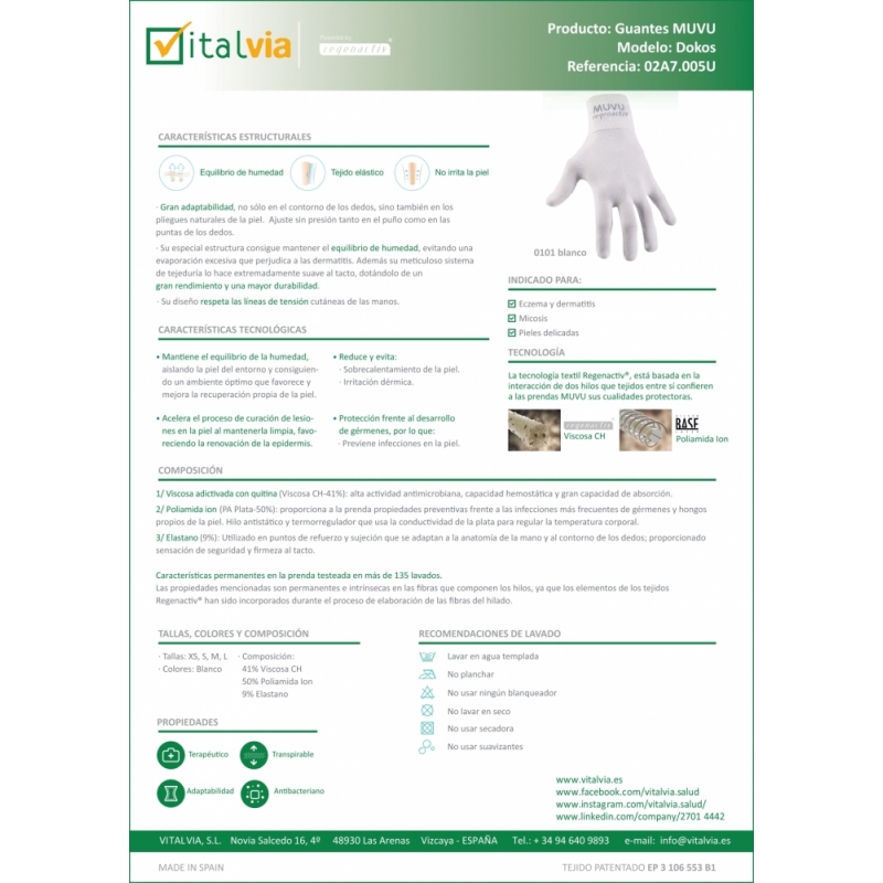I guanti MUVU sono realizzati con l'innovativa Regenactiv® Technology (tessuto brevettato) basata sull'interazione di due fili intrecciati . Un filato principale, naturale e biodegradabile, di viscosa assorbente con particelle di chitina intrecciato con un secondo filato di poliammide ionizzata argento su filato di elastan.