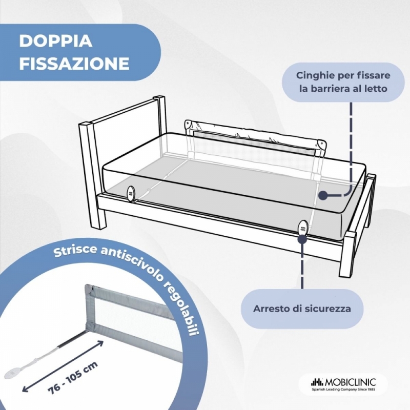 La sicurezza è la nostra priorità, ecco perché è dotato di un doppio sistema di bloccaggio . Da un lato, le cinghie garantiscono una migliore presa sul letto, offrendo maggiore stabilità e prevenendo possibili cadute. Dall'altro, l'altezza del design offre una protezione extra, consentendo una maggiore tranquillità .