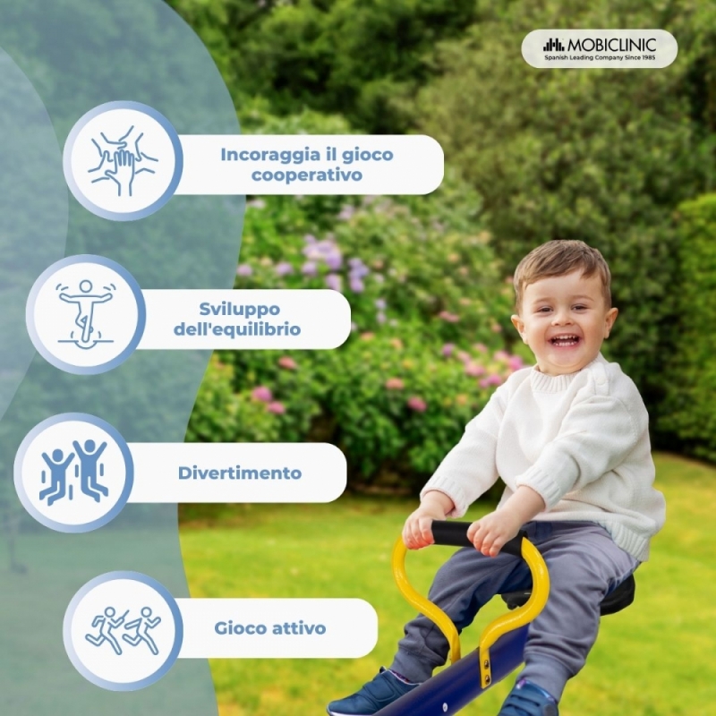 L'altalena Mobifun è progettata per far giocare due bambini contemporaneamente, incoraggiando l'interazione, la cooperazione e lo sviluppo delle abilità sociali fin dalla tenera età. Le sue sedute comode ed ergonomiche offrono una postura comoda durante il gioco.