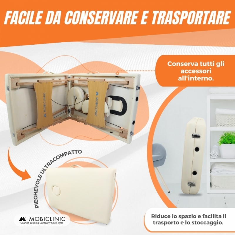 PIEGHEVOLE: quindi occupa poco spazio e può essere trasportato se si effettuano visite a domicilio. Per un maggiore comfort, è costituito da maniglie che facilitano il trasporto. Include borsa da viaggio.