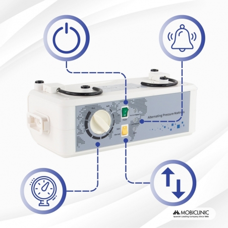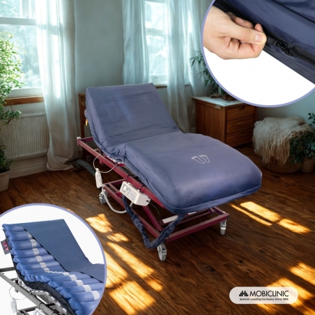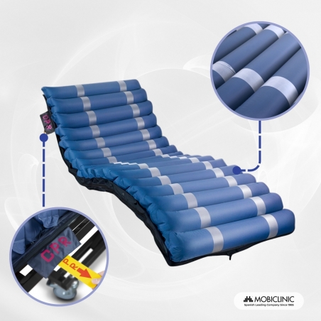 Si adatta a qualsiasi letto, quindi può essere utilizzato a casa o in ospedale, garantendo un sonno ristoratore, confortevole e sicuro. È molto facile da installare: si estende su un materasso antidecubito, lasciando i tubi ai piedi del letto per collegarli al compressore silenzioso incluso.