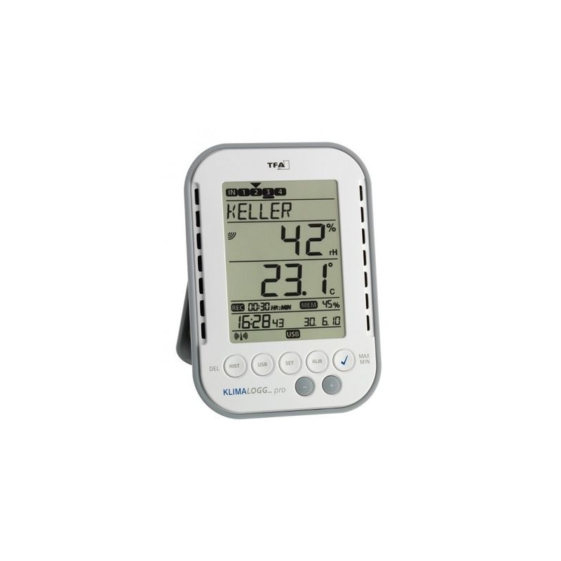 Questo termoigrometro viene utilizzato per misurare la temperatura e l'umidità relativa di un ambiente Termoigrometro da parete con funzione di datalogger di data logging. Supporta 8 sensori wireless esterni aggiuntivi (non inclusi).