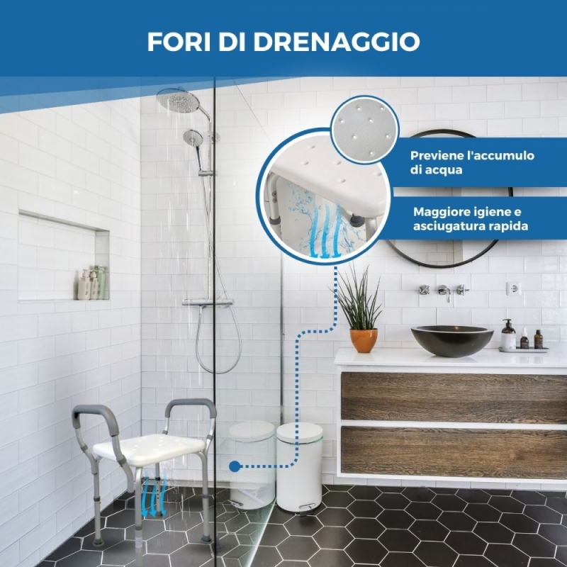 Lo sgabello da bagno dispone di gambe regolabili in altezza, con gommini antiscivolo che gli permettono di adattarsi a qualsiasi tipo di bagno, garantendo sicurezza ad ogni utilizzo. Inoltre, ha fori di drenaggio sul sedile, che consentono il flusso di acqua, garantendo maggior igiene.