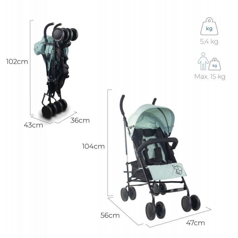 ADATTO A: Il passeggino reclinabile Elefant è un passeggino compatto che può essere utilizzato fino a quando il bambino raggiunge un peso massimo di 15 kg secondo le normative.