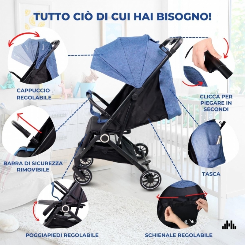 CONFORTEVOLE E FUNZIONALE: Il suo semplice funzionamento a leva singola e i materiali leggeri lo rendono un'opzione davvero comoda per genitori e bambini, poiché le sue quattro ruote ammortizzate offrono un movimento fluido.
