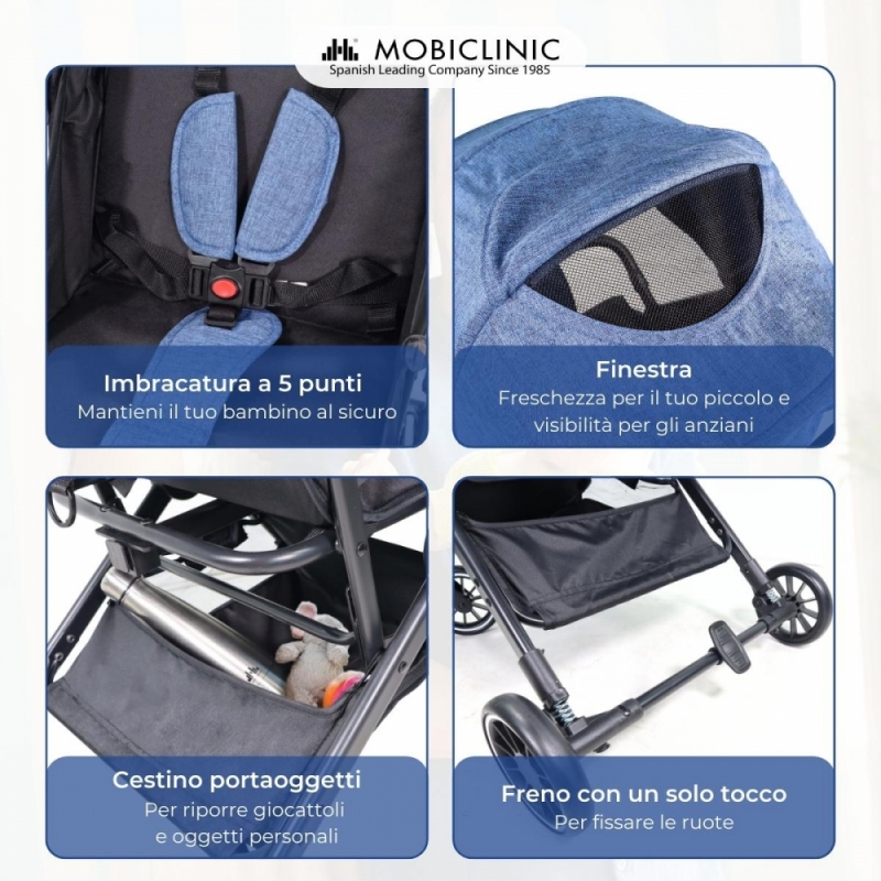 La sua struttura leggera e monocomando è composta da una maniglia in EVA e un corrimano per bambini con paracolpi anteriore rimovibile. Allo stesso modo, il suo poggiapiedi è regolabile per adattarsi alle esigenze di ogni bambino, così come il nastro che contiene per controllare lo schienale o la regolazione della cappottina. Inoltre, grazie al suo cestino puoi trasportare tutti gli accessori necessari per la cura del bambino.