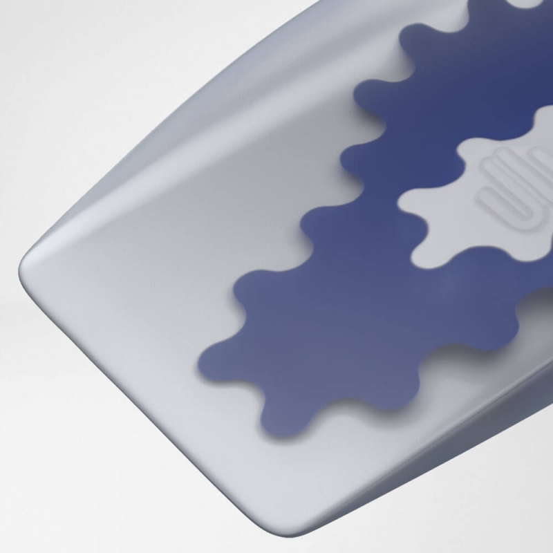 Ha tre zone di durezza differente che assicurano il giusto sollievo: all'interno c'è un punto bianco, una zona particolarmente morbida che assorbe la pressione del centro del dolore, la zona sensibile direttamente intorno allo sperone del tallone. La zona blu intorno al punto bianco è un po' più dura e scarica la fascia plantare e la incava. La zona grigia dura sul bordo esterno guida delicatamente il piede quando si fa un passo e lo sostiene quando si cammina.