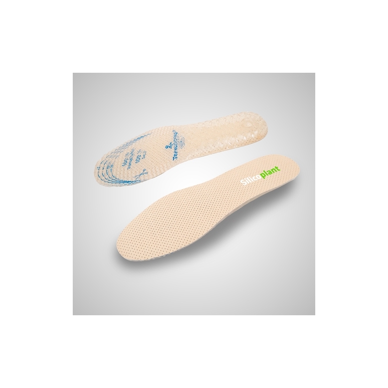 La soletta in silicone e gel è progettata con gel di grado medico ed essenza di aloe vera. Il suo design permette la traspirazione del gel e facilita il flusso d'aria ad ogni passo, evitando l'effetto vento. Basso profilo. Foderato con tessuto tecnico ad effetto permanente: antibatterico, 100% traspirante, assorbente, antiodore, antiacaro e termoregolatore. Per tutti i tipi di pelle