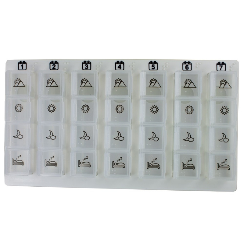 Per ogni giorno della settimana sono presenti 4 divisioni con l'icona di ogni momento del giorno, anche in formato braille. Corrispondono a colazione, pranzo, cena e notte ma si può adattare alle necessità di ogni paziente.