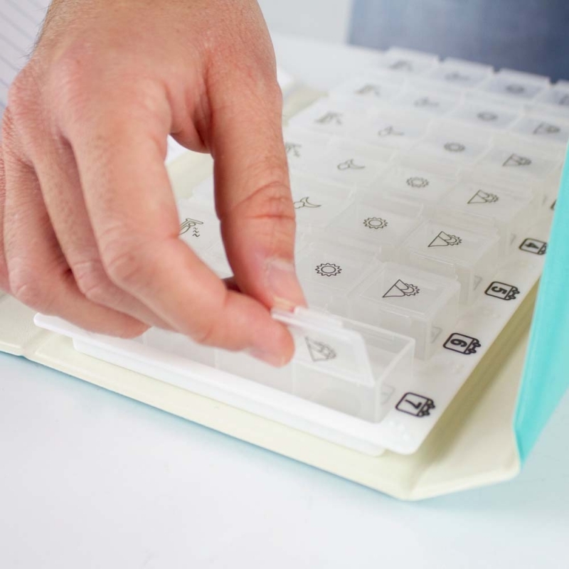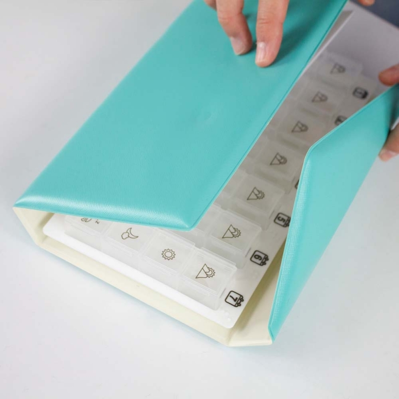 Il contenitore pillole settimanale è inserito in un organizzatore verde con chiusura magnetica, molto pratico e discreto.
