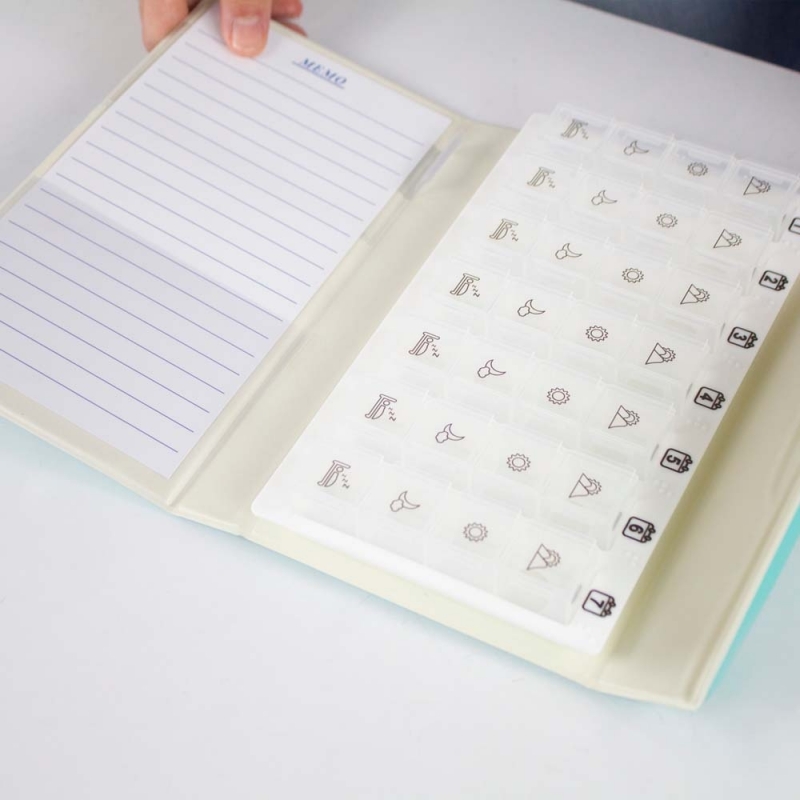 Il portacompresse settimanale è inserito in un astuccio che contiene anche un taccuino di 8 pagine, un posto per le penne e un portatessera.