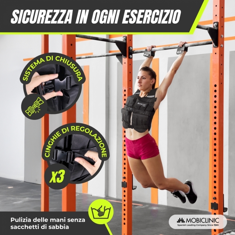Il gilet è dotato di elastici laterali che si adattano a diversi tipi di corporatura, offrendo comfort e mobilità totale. Dispone inoltre di spallacci imbottiti che offrono un comfort extra e prevengono possibili danni dovuti al peso. La sicurezza è garantita grazie al sistema di chiusura a tre clip che fa sì che il gilet rimanga fisso e stabile durante qualsiasi esercizio.
