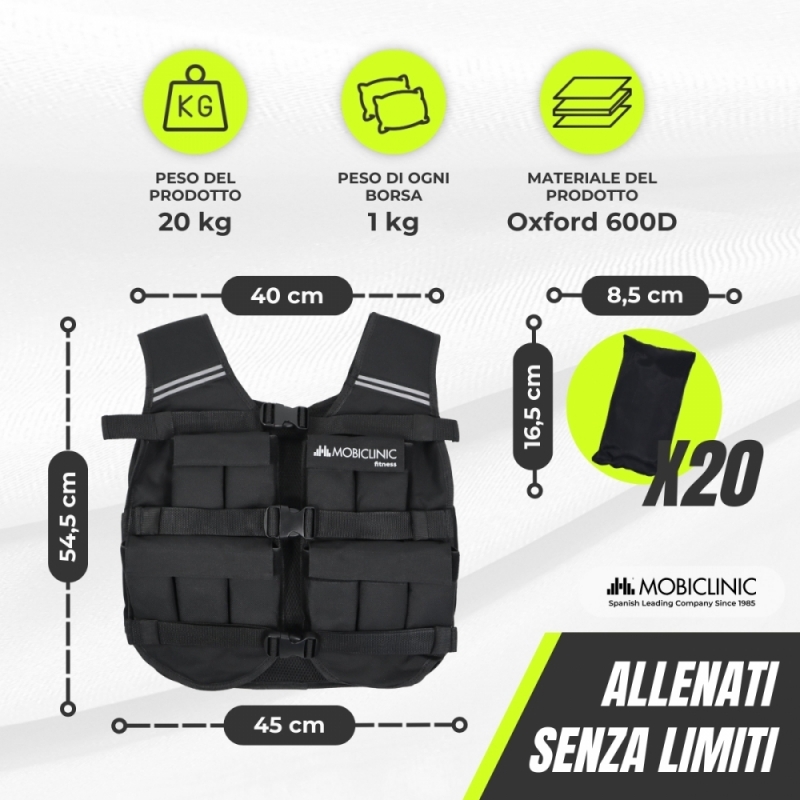 MATERIALI DI ALTA QUALITÀ: Realizzati con tessuto Oxford, neoprene e striscia riflettente. Il gilet con zavorra Iron20 è resistente, traspirante e sicuro per l'allenamento in condizioni di scarsa visibilità. I sacchi pesi sono fatti di sabbia e pesano 470 g/sacco.