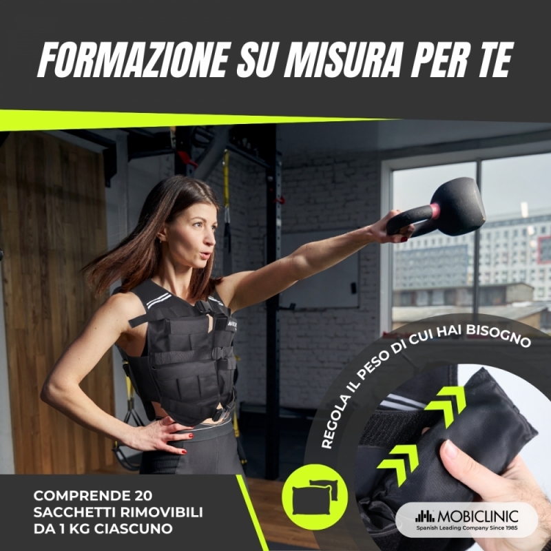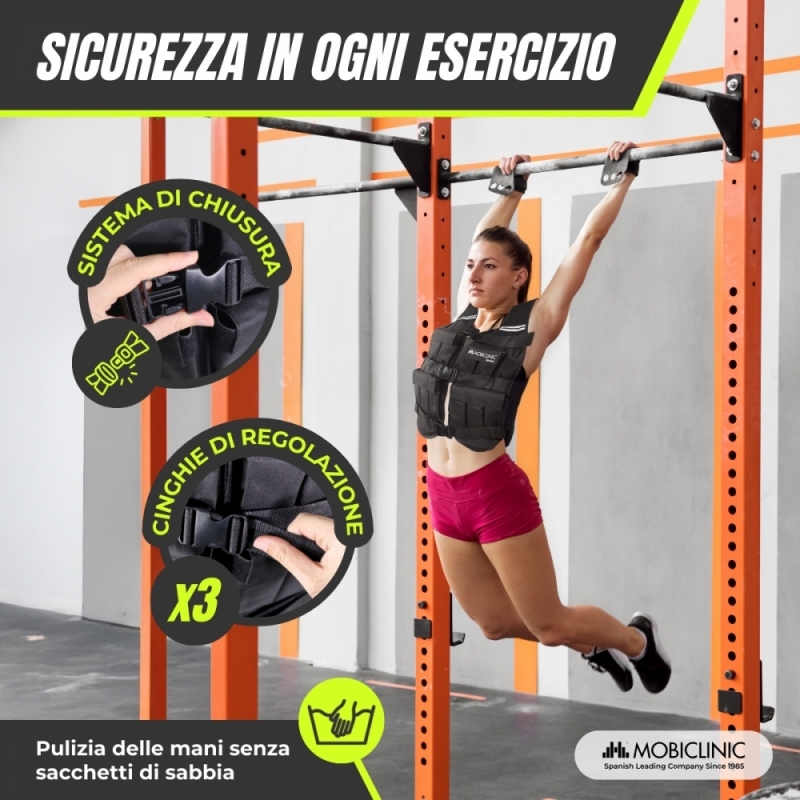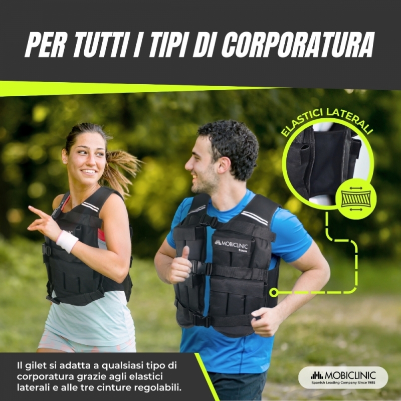Il gilet è dotato di elastici laterali che si adattano a diversi tipi di corporatura, offrendo comfort e mobilità totale. Dispone inoltre di spallacci imbottiti che offrono un comfort extra e prevengono possibili danni dovuti al peso. La sicurezza è garantita grazie al sistema di chiusura a tre clip che fa sì che il gilet rimanga fisso e stabile durante qualsiasi esercizio.