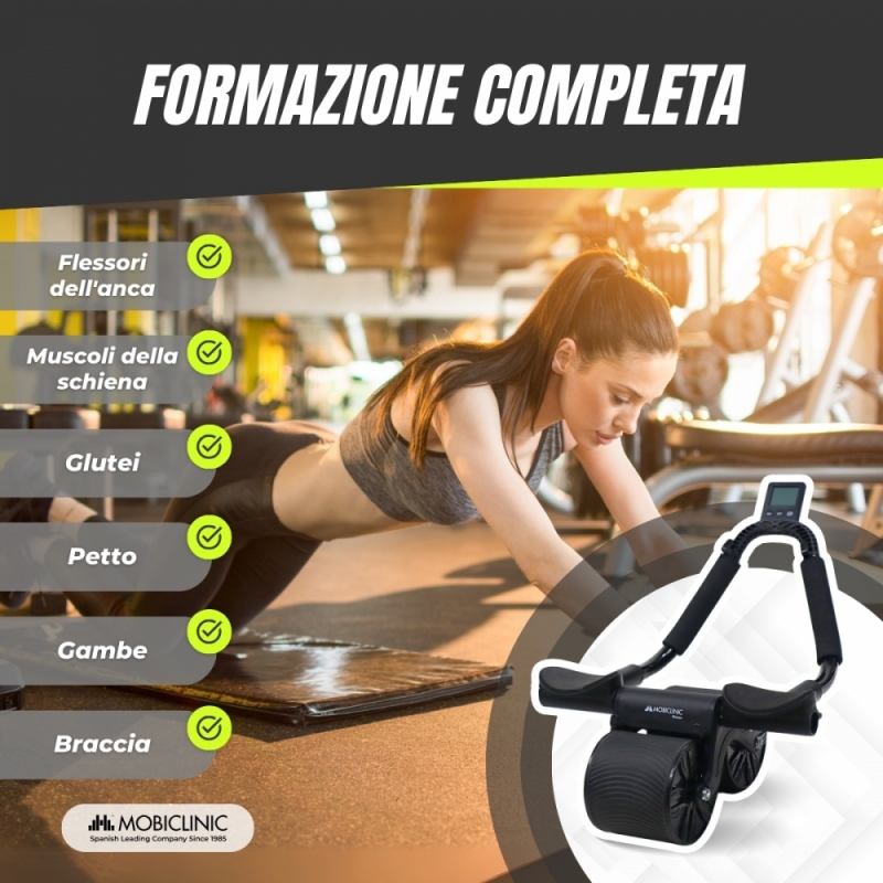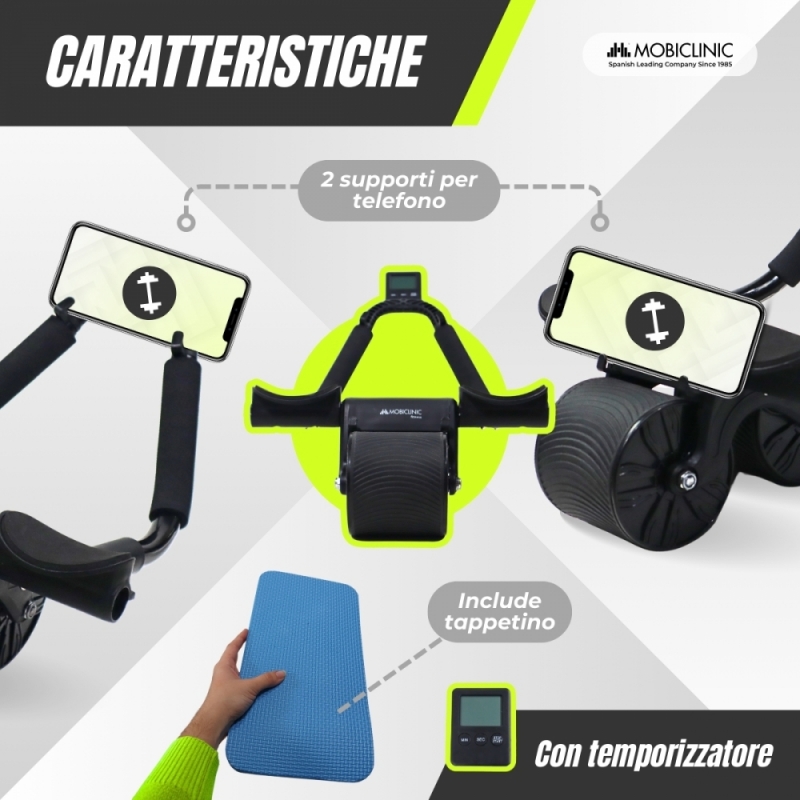 Questo rullo è dotato di tre accessori che lo rendono ancora più completo, un timer digitale per stabilire intervalli di lavoro e controllare il tempo dei tuoi esercizi, ottimizzando al massimo ogni sessione, questo ti permette di migliorare le prestazioni e seguire una routine strutturata. Dispone inoltre di due supporti per telefono che ti permetteranno di guardare video o seguire applicazioni di allenamento durante i tuoi esercizi, rendendo le tue routine più interattive e motivanti. Infine, è dotato di tappetino antiscivolo che garantisce uno spazio sicuro e confortevole per il tuo allenamento, proteggendo le ginocchia durante lo scivolamento e offrendo maggiore presa.