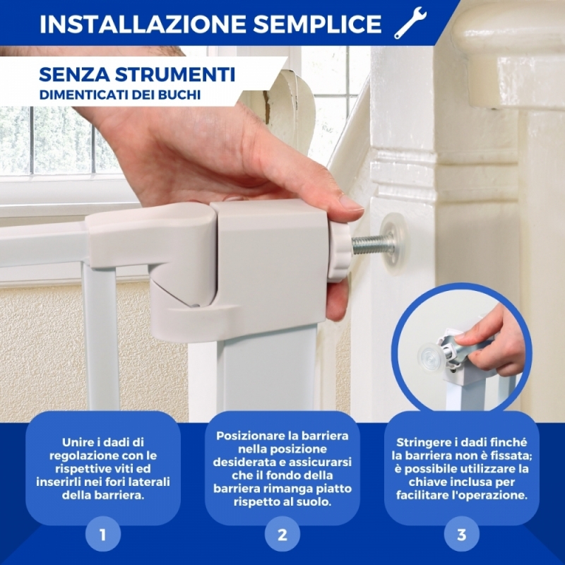 FACILE DA INSTALLARE: Realizzata in metallo con finitura laccata bianca, con la recinzione Raily non è necessario forare il muro grazie alle sue viti a pressione. Può essere installato ovunque si ritenga e per tutto il tempo necessario, senza lasciare traccia una volta rimosso.