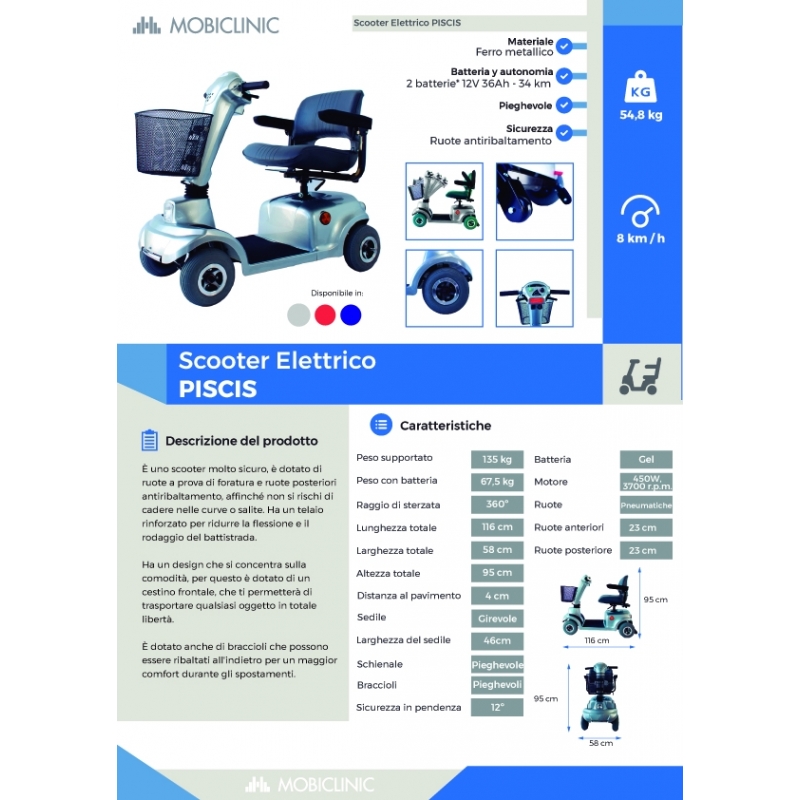 Lo scooter per disabili Piscis aiuta a risolvere gli ostacoli e le difficoltà che le persone a mobilità ridotta possono incontrare nella vita di tutti i giorni al momento di spostarsi. Inoltre, questo scooter anziani a quattro ruote è stato progettato per essere utilizzato sia all'interno che all'esterno.