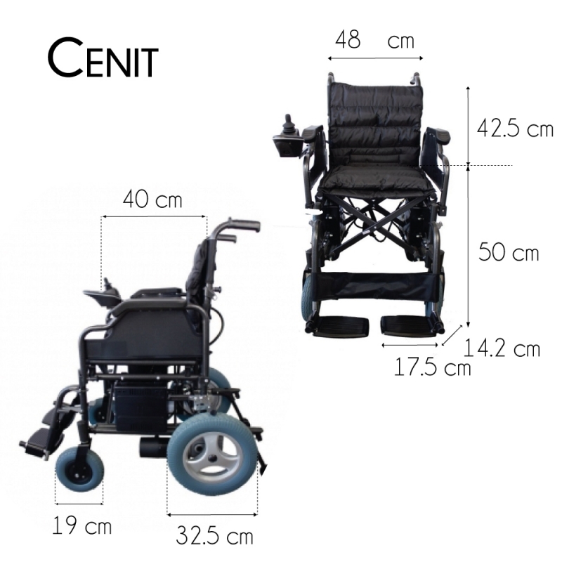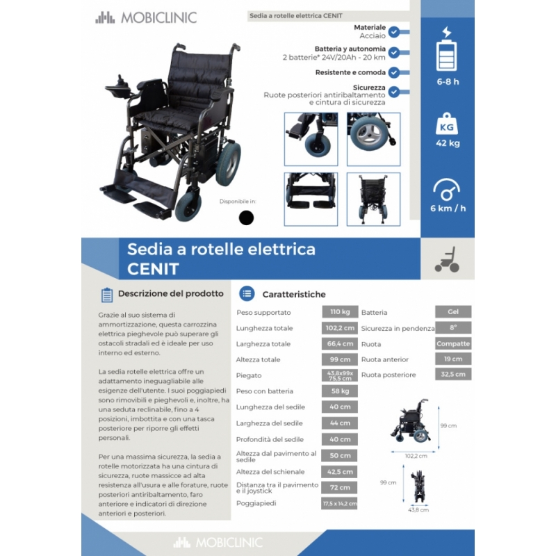 BATTERIA E AUTONOMIA: la carrozzina elettrica modello Cenit è dotata di 2 batterie ricaricabili al gel da 12V/20AH. La sua autonomia è di 20 km.