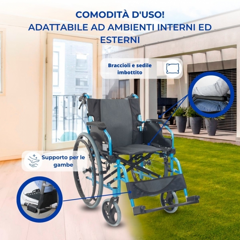 CONFORTEVOLE: è dotata di braccioli pieghevoli e di un'imbottitura per un grande comfort, che la rende una sedia a rotelle molto comoda per le persone anziane