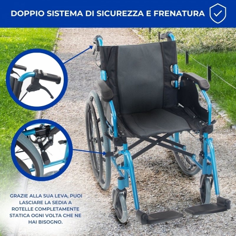 È una carrozzina economica , dotata di grande autonomia con ruote che riducono al minimo lo sforzo e freni manuali che impediscono possibili ribaltamenti. I freni manuali sono una garanzia di sicurezza poiché impediscono l'avviamento e il ribaltamento della carrozzina in condizioni avverse.
