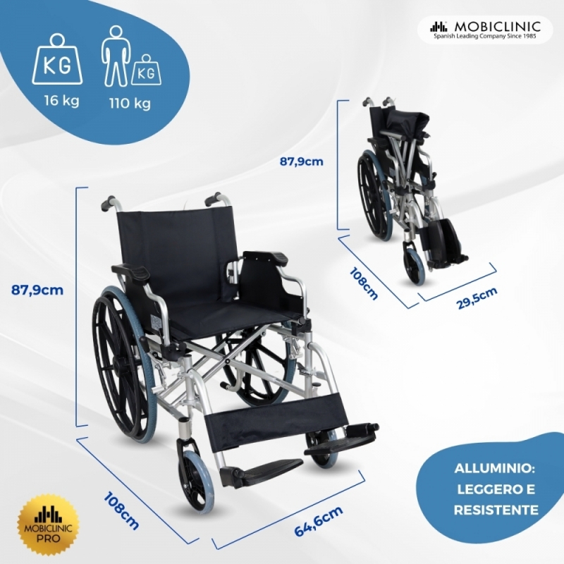LEGGERA E ROBUSTA: La struttura in alluminio di questa sedia a rotelle pieghevole mostra grande leggerezza e resistenza, pesando solo 16 kg.