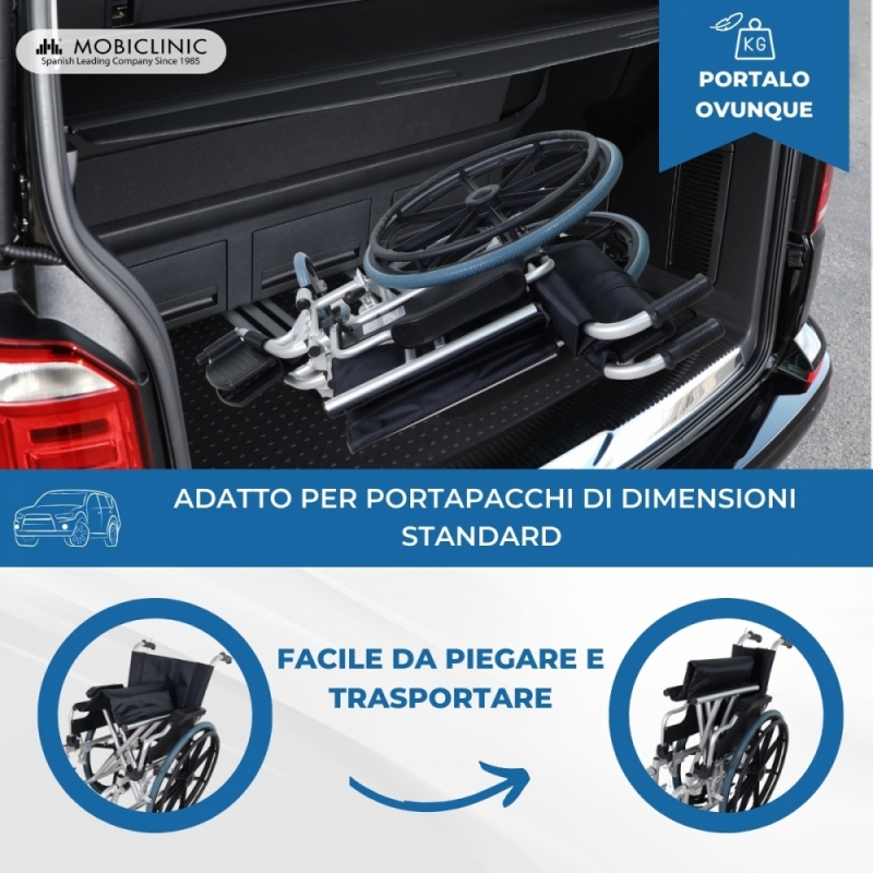 È il mezzo di trasporto ideale per tutte quelle persone che hanno difficoltà a camminare o muoversi, così come per le persone che hanno appena subito un'operazione o per gli anziani. Questa sedia a rotelle non è una sedia qualsiasi, poiché si distingue anche per il suo design particolare e innovativo con una tasca sullo schienale.
