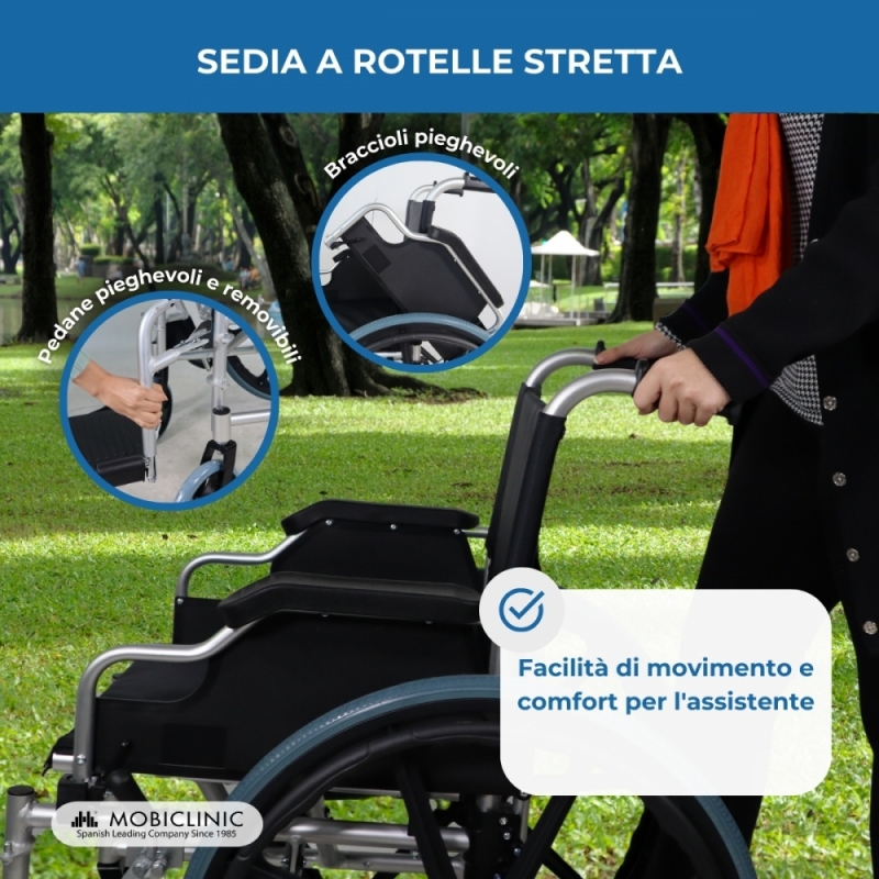 Le sue ruote da 20,5 e 58,5 cm di diametro facilitano il lavoro dell'accompagnatore, poiché gli permette di affrontare lunghi viaggi senza complicazioni, oltre ad essere una comoda sedia a rotelle . Ha quattro ruote solide e raggi MAG.