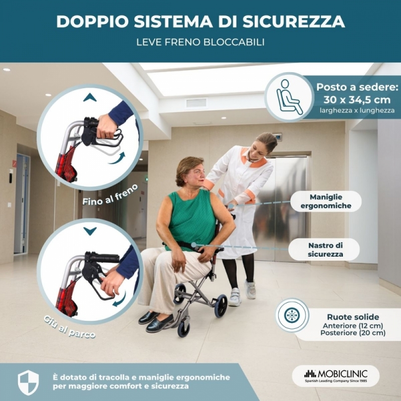 Grazie alla facilità di piegatura e alla leggerezza di questa sedia a rotelle in alluminio può essere trasportata ovunque con il minimo sforzo (include anche una borsa per il trasporto). Questo ti permetterà di riporla comodamente in casa o anche di ripiegarla se avrai necessità di metterla in posti stretti. La doppia barra inferiore fornisce un maggior senso di sicurezza, ed è composta da un materiale ignifugo. Lo schienale ergonomico e la seduta della carrozzina per disabili permettono il massimo comfort per i pazienti, così come per i loro accompagnatori, in quanto permette l'innalzamento sia dei braccioli che dei poggiapiedi. In breve, questa è la sedia a rotelle pieghevole ideale se state cercando sicurezza, comfort e facilità d'uso.
