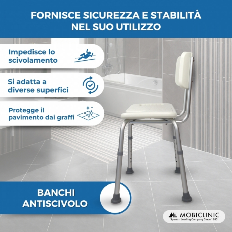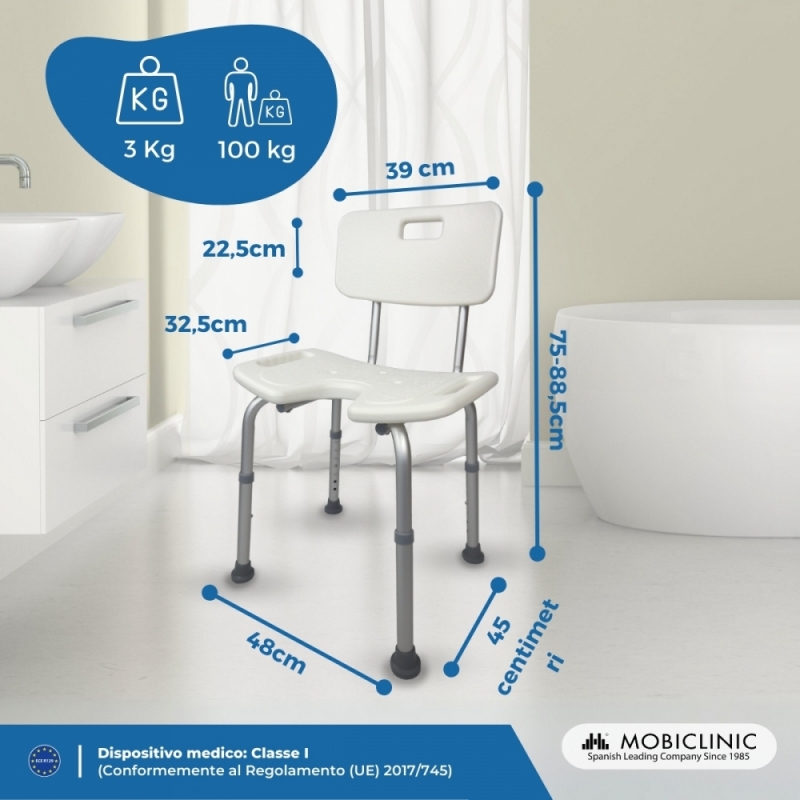 La sedia da bagno "Marisma" è stata appositamente progettata per fornire la massima sicurezza e il massimo comfort all'utente nel suo utilizzo. È ideale per l'uso nella doccia o nella vasca da bagno. Il design delle sue gambe e i cuscinetti in gomma antiscivolo di cui è dotato, lo fanno adattare perfettamente alla superficie d'appoggio, garantendo stabilità durante l'uso.