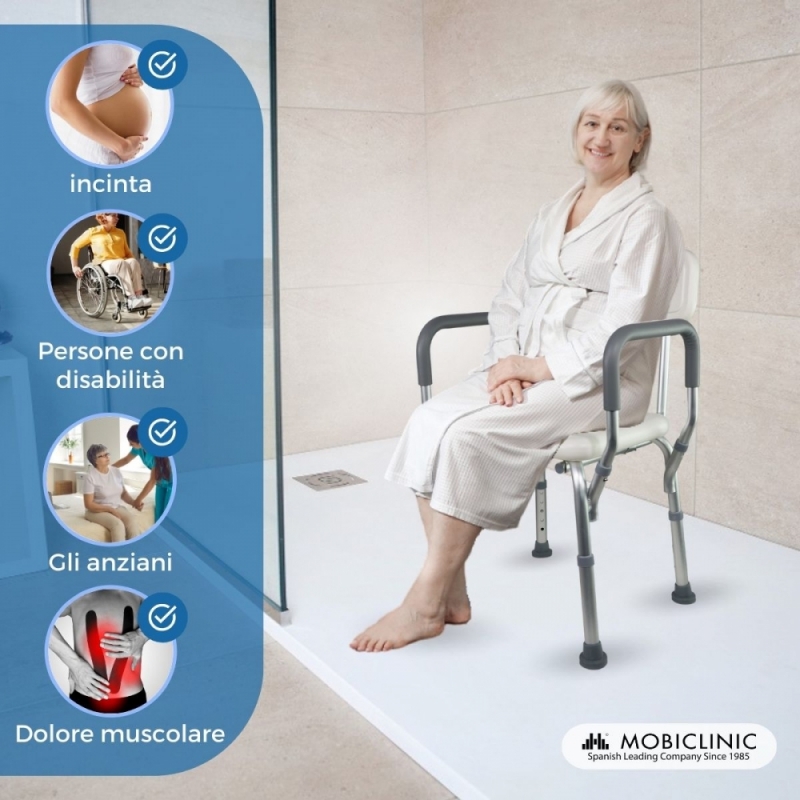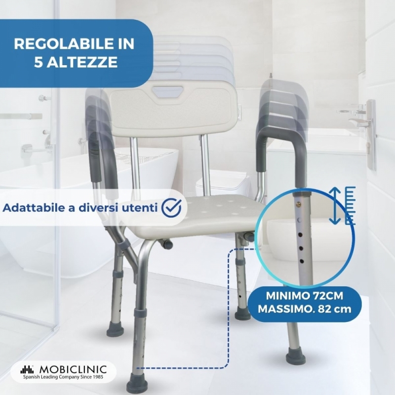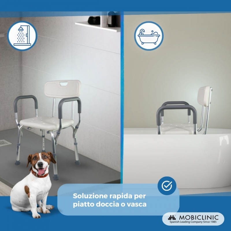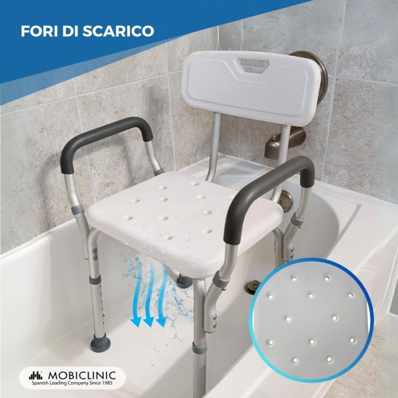 È molto semplice da montare e da usare, infatti con un solo click è possibile rimuovere sia lo schienale che i braccioli della seduta per doccia. Inoltre, i fori situati sul sedile doccia, aiutano la fuoriuscita dei liquidi.