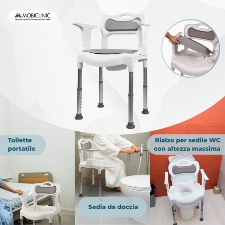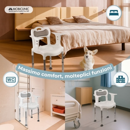 MASSIMO COMFORT: La sedia da bagno Guido è dotata di cuscini su seduta e schienale, offrendo un'esperienza più confortevole rispetto ad altri modelli. Inoltre, grazie al suo design, può essere utilizzata come sedia da bagno, WC portatile o sedia da doccia.