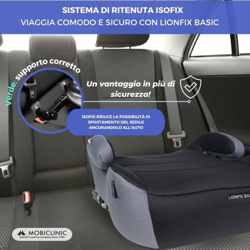 Con Lionfix Basic avrai tutte le garanzie di sicurezza in prima linea grazie al suo sistema IsoFix. Si tratta di un tipo di ancoraggio facile da installare e consente di fissare rapidamente il sistema di ritenuta per bambini direttamente al telaio del veicolo, offrendo maggiore stabilità e riducendo il rischio di colpo di frusta in caso di impatto frontale con questo sollevatore per auto.