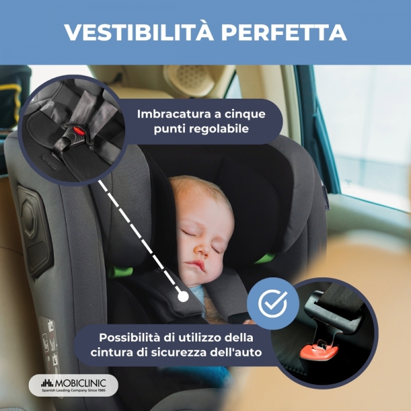Dotata di un sistema di sicurezza Top Tether, la sedia garantisce un fissaggio aggiuntivo come terzo punto di ancoraggio, impedendo il movimento in avanti in caso di collisione e garantendo stabilità superiore durante ogni viaggio. Inoltre, dispone di un'imbracatura a 5 punti integrata e regolabile che mantiene il bambino saldamente trattenuto, distribuendo le forze in modo uniforme per ridurre al minimo i rischi.