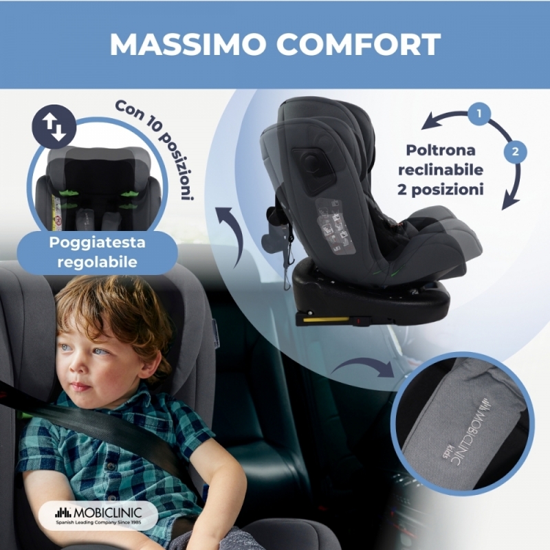La rotazione di 360º della sedia ne semplifica la movimentazione e permette di posizionare facilmente il bambino da qualsiasi angolazione, oltre ad offrire la possibilità di orientare la sedia in avanti o all'indietro, a seconda dello stadio di sviluppo. Il poggiatesta è regolabile in 10 posizioni, permettendo alla sedia di crescere con il bambino, adattandosi in ogni momento alla sua altezza. Inoltre, ha diverse posizioni reclinabili sia in avanti che all'indietro.
