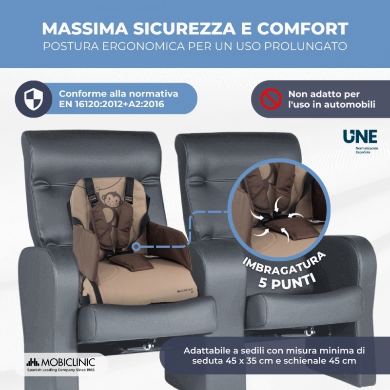 - Regolabile su sedili con le seguenti misure minime: seduta 45 x 35 cm e schienale 45 cm (vedi ultima immagine)