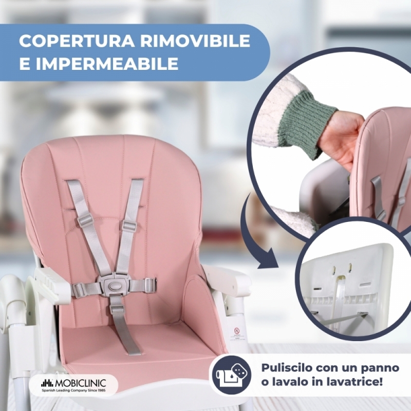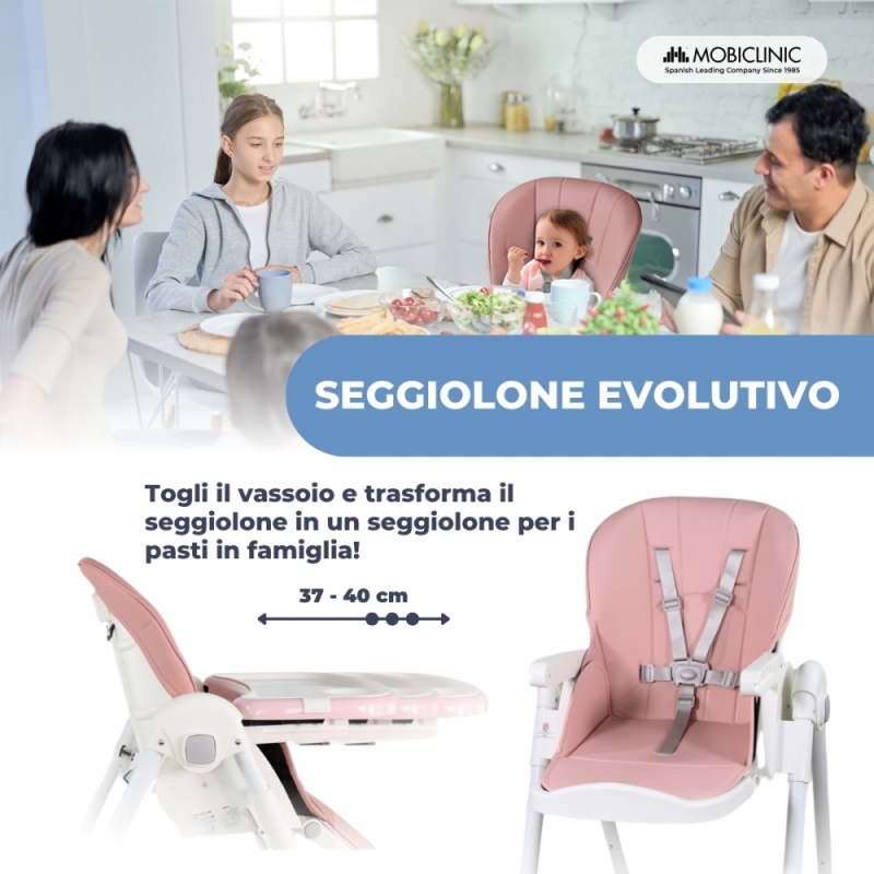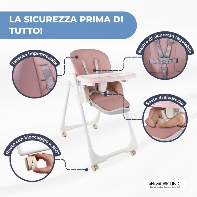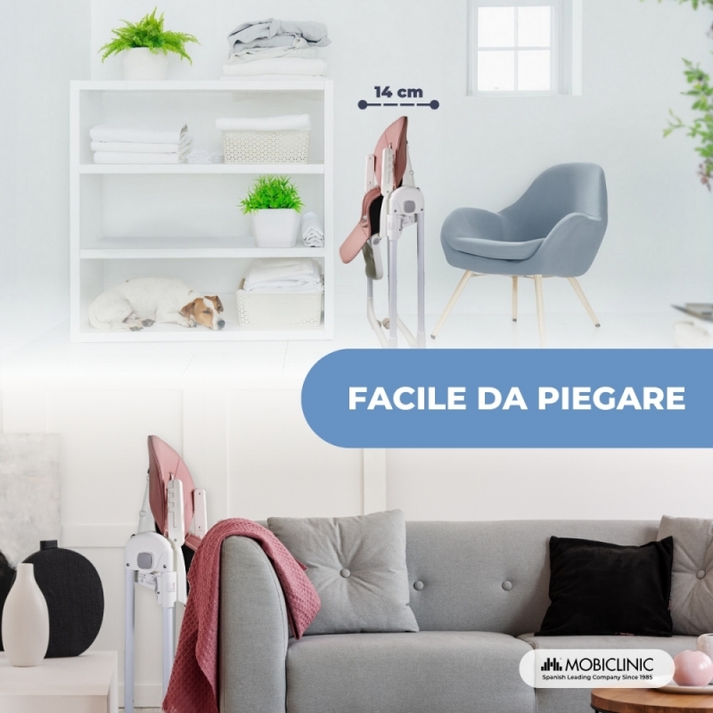 Questo modello, completamente pieghevole e versatile, occupa poco spazio ed è dotato di ruote con freno per un trasporto migliore e più confortevole. Grazie al suo design, offre una moltitudine di possibilità come sedile, in modo che il bambino possa gradualmente unirsi al tavolo e imparare a usare le posate.