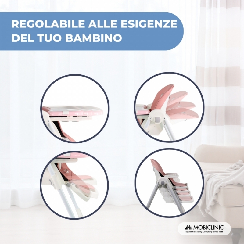 REGOLAZIONI MULTIPLE: Questo seggiolone offre una moltitudine di regolazioni per adattarsi all'altezza e al comfort del bambino: la sua altezza può essere regolata in 7 diverse posizioni, posizionare il vassoio più o meno vicino e posizionare il poggiapiedi più o meno dritto a seconda delle necessità e l'uso che vuoi dare
