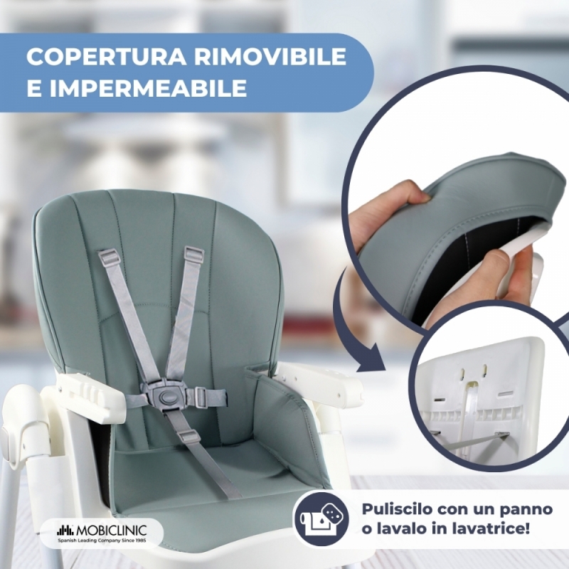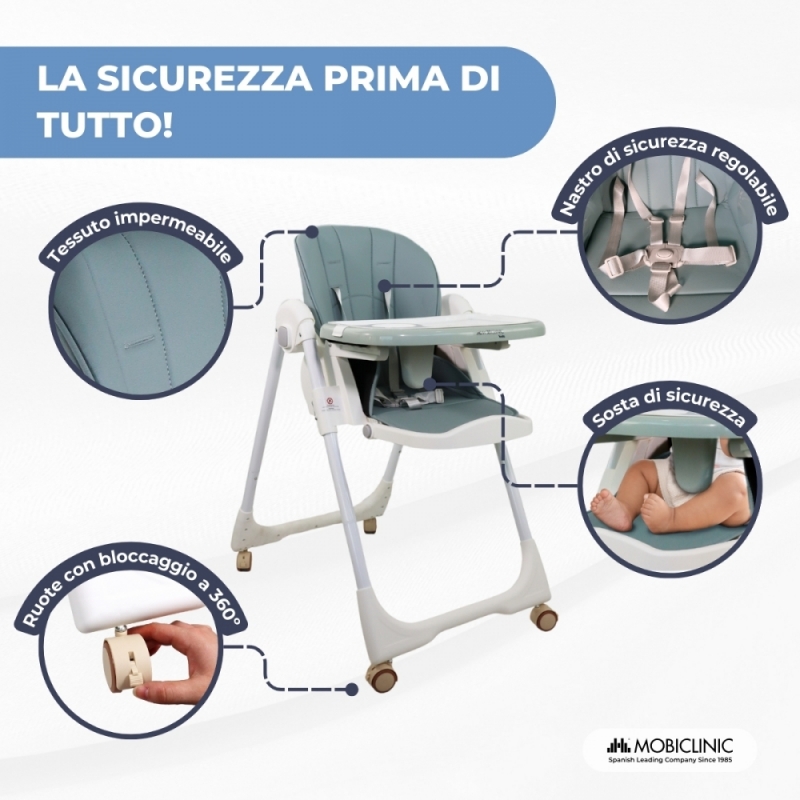 Questo modello, completamente pieghevole e versatile, occupa poco spazio ed è dotato di ruote con freno per un trasporto migliore e più confortevole. Grazie al suo design, offre una moltitudine di possibilità come sedile, in modo che il bambino possa gradualmente unirsi al tavolo e imparare a usare le posate.