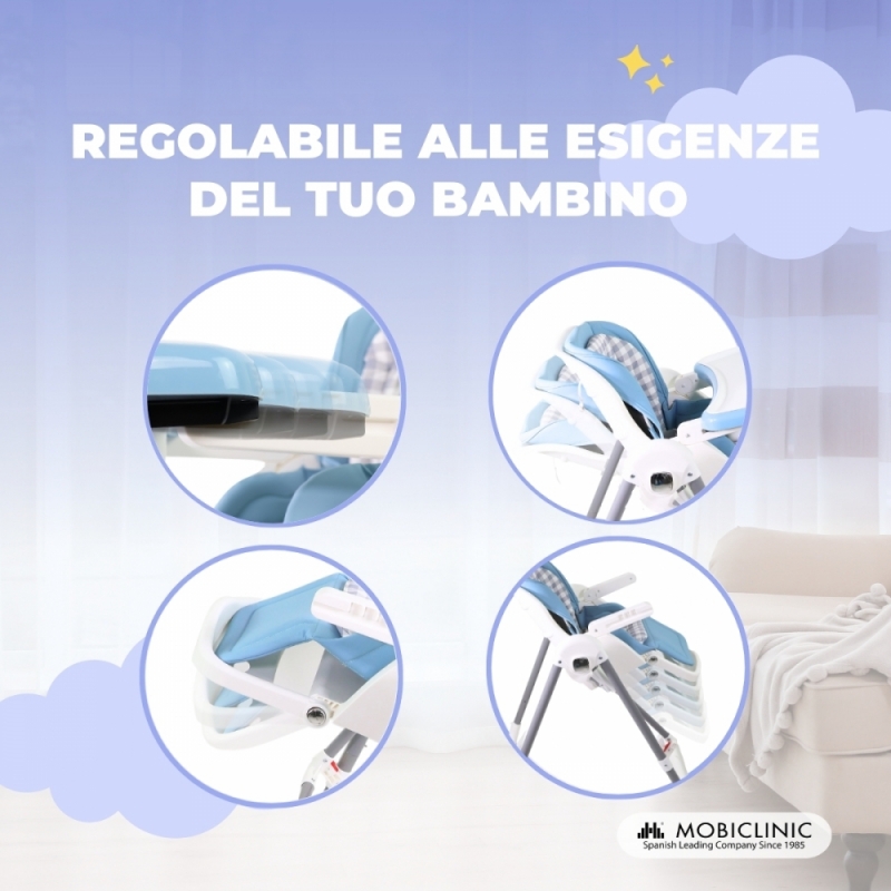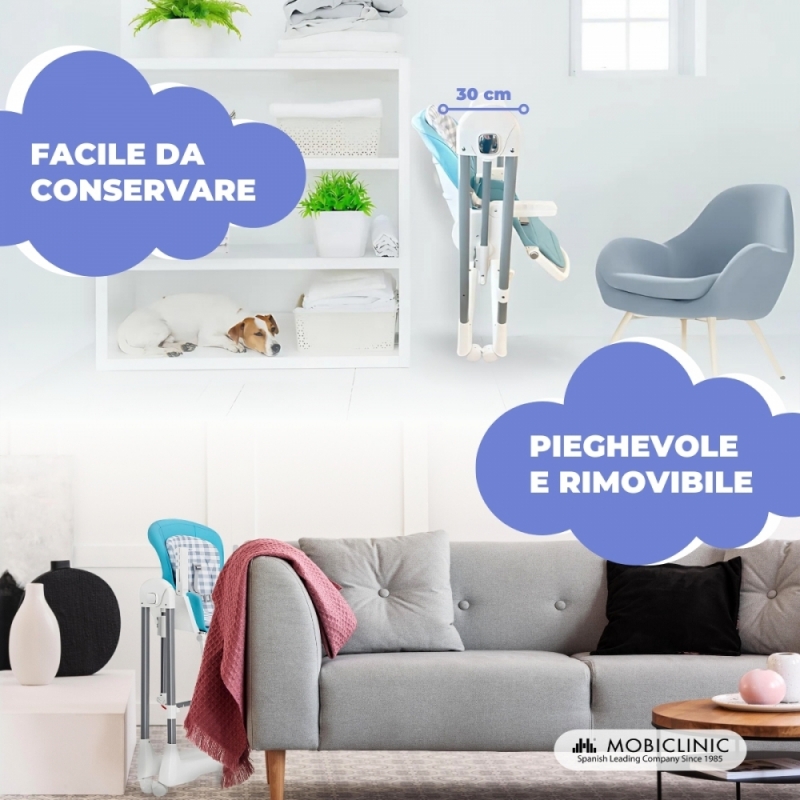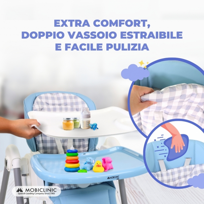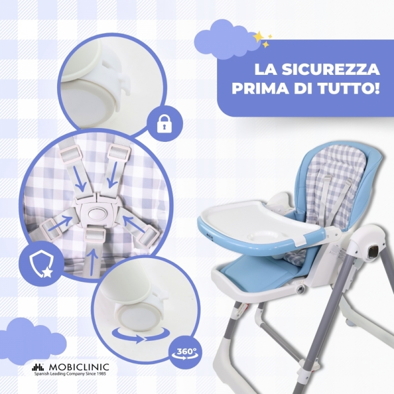 La sicurezza è la nostra priorità , con un'imbracatura a 5 punti, ruote e freni di rotazione per evitare cadute . Le sue 4 ruote girevoli a 360º consentono una manovrabilità totale. Il doppio vassoio estraibile in 3 posizioni è facile da pulire, e il semplice sistema di piegatura permette di riporlo in ogni piccolo spazio.