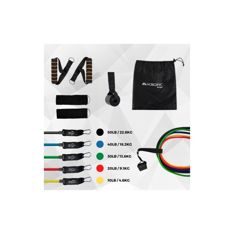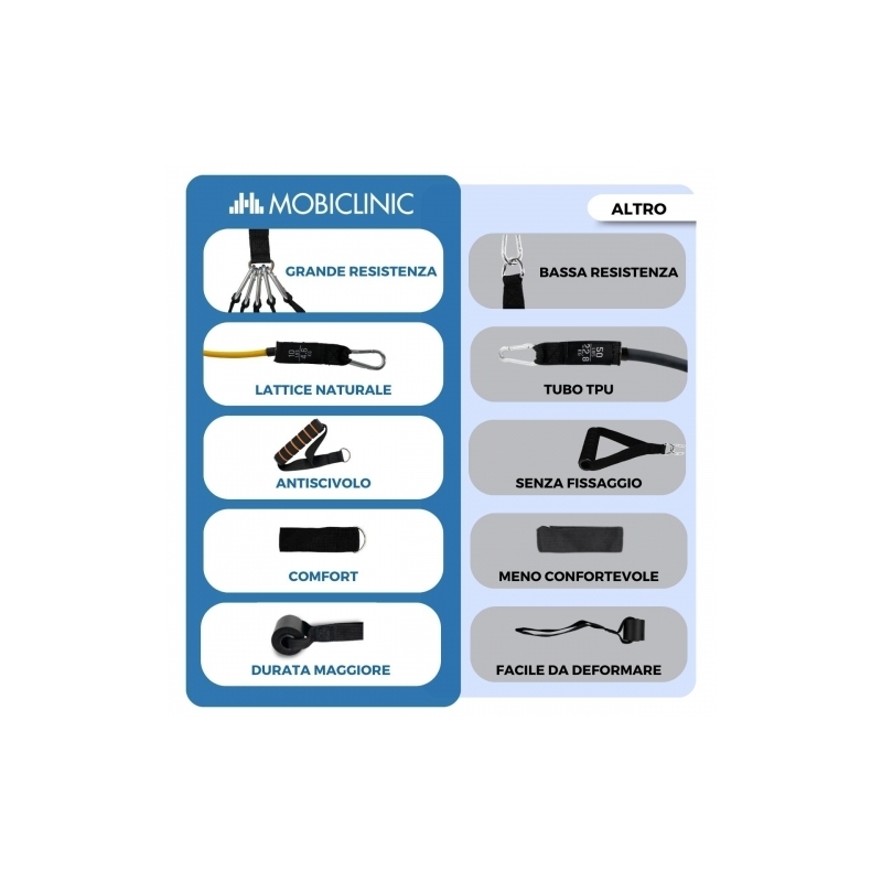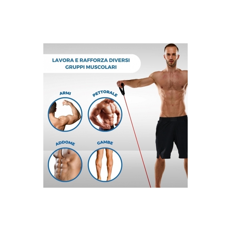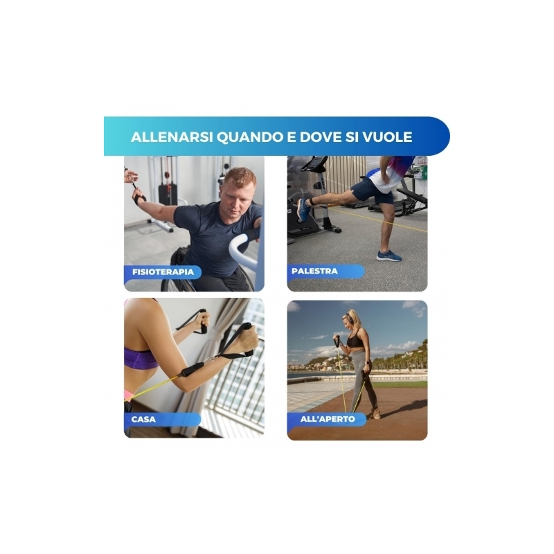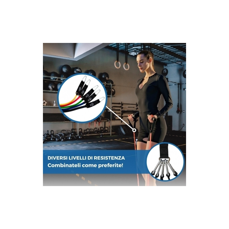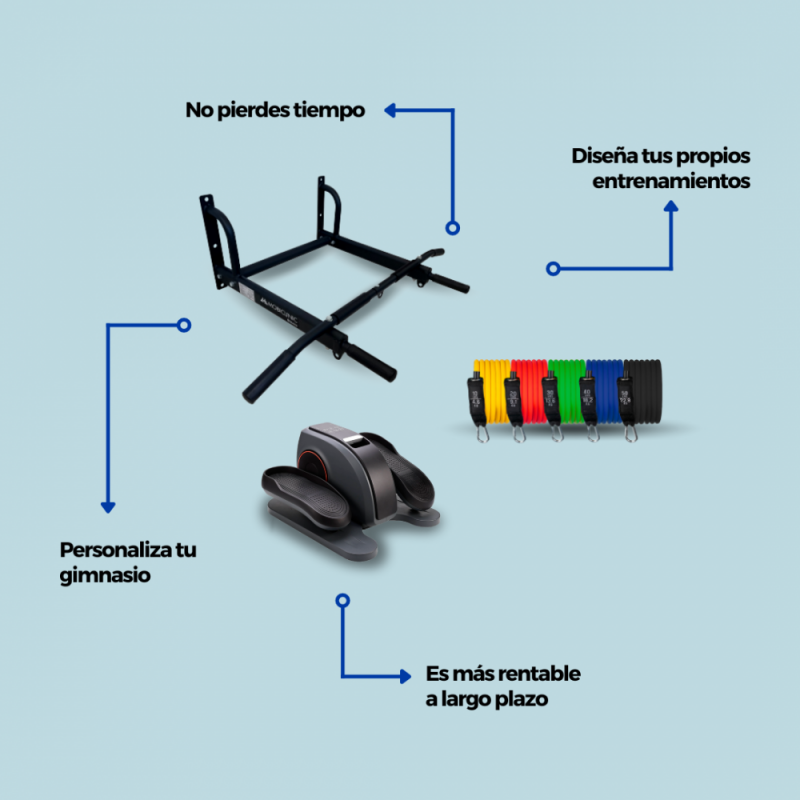 QUESTA CONFEZIONE CONTIENE: tubi elastici per migliorare la resistenza, il mini cross-trainer Veleta o movimento centrale , ideale per allenare le gambe, e una barra per trazioni con kit di installazione