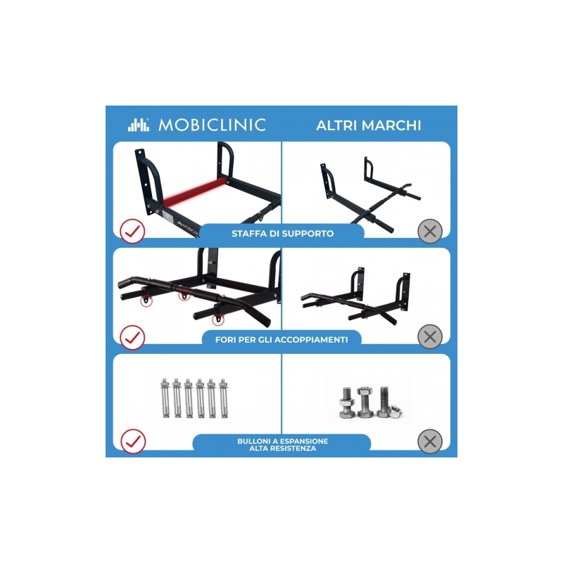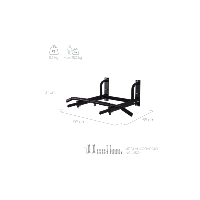 - Barra di sollevamento: include un kit di ancoraggio che facilita l'installazione della barra. Inoltre, diversi ganci per potervi applicare gli accessori per gli esercizi.