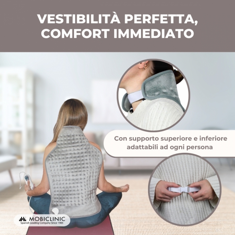 ADATTABILE : Il cuscinetto dorsale e cervicale si adatta alla tua anatomia grazie alla sua chiusura in velcro nella zona del collo e una fascia elastica regolabile in vita. Il termoforo copre l'intera schiena e distribuisce il calore in modo uniforme dal collo alla vita