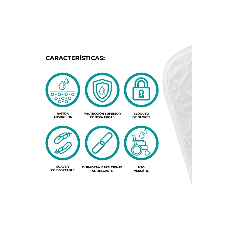 Questo pack di 3 panni assorbenti riutilizzabili per sedie a rotelle può essere utilizzato in caso di incontinenza a letto e in situazioni di eccessiva sudorazione, in quanto impedisce l'eccesso di umidità sulla pelle del paziente. È un materiale traspirante, lavabile, impermeabile e facile da usare e regolare sulla sedia. Grazie alla composizione a 4 strati, si ottiene il corretto assorbimento di liquidi e fluidi, mantenendo la pelle del paziente pulita e asciutta.